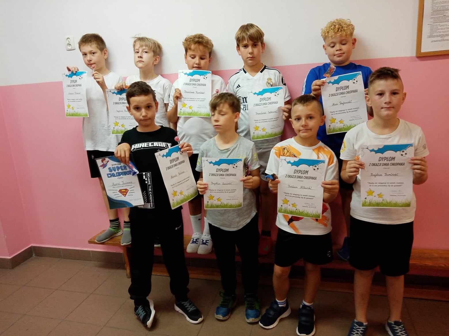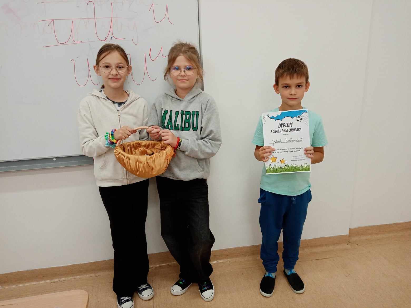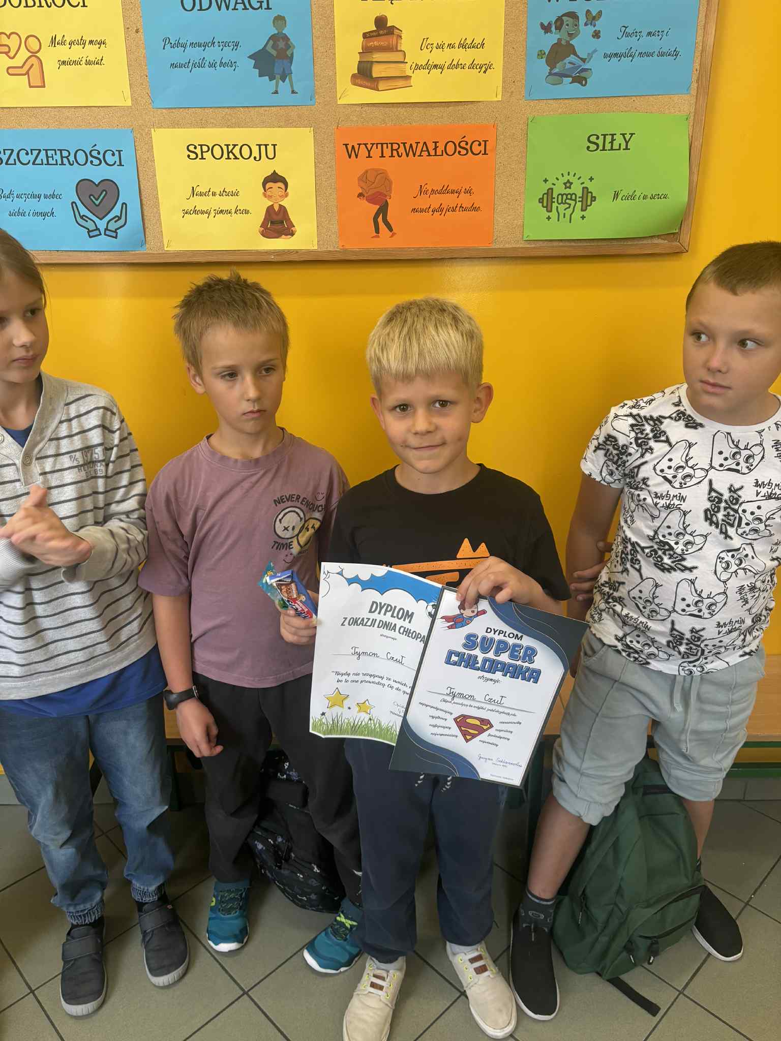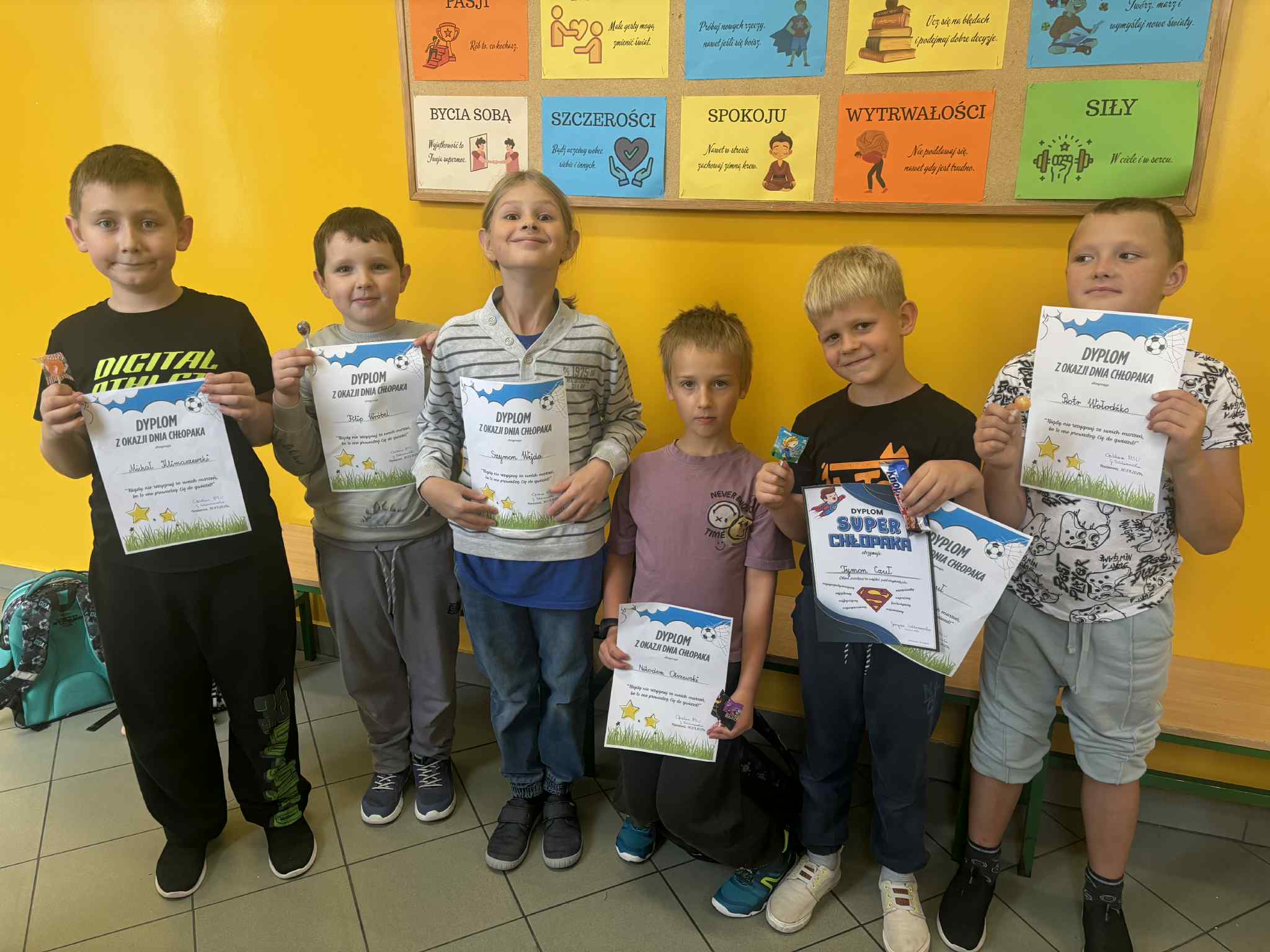 Dnia 30.09.2025 roku obchodzono w naszej szkole Dzień Chłopaka. To wyjątkowa okazja, by docenić wszystkich chłopców – tych małych i dużych, tych spokojnych i tych pełnych energii! Z tej okazji przygotowano wiele miłych niespodzianek i atrakcji, które wywołały uśmiech na niejednej twarzy! Każdy chłopiec otrzymał specjalny dyplom uznania – jako symbol sympatii, szacunku i wdzięczności za to, że po prostu są – wyjątkowi, zabawni i niepowtarzalni! W każdej klasie dziewczęta oddały głosy, wybierając Najsympatyczniejszego Chłopaka – kolegę, który swoją postawą, życzliwością i uśmiechem zdobył ich największe uznanie. To była świetna zabawa, a także okazja, by zauważyć tych, którzy często pomagają innym, są uprzejmi i zawsze można na nich liczyć! Zwycięzcy w każdej klasie otrzymali dyplom „Super Chłopaka” oraz słodki upominek, który był miłym podziękowaniem za ich serdeczność i pozytywną energię. Na korytarzu pojawiła się kolorowa gazetka poświęcona Dniu Chłopaka – z życzeniami i rysunkami. Dzięki zaangażowaniu rodziców, w klasach pojawiły się także upominki, które umiliły świętowanie. Wszystkim Chłopcom – dużym i małym – życzymy dużo radości, spełnienia marzeń, wspaniałych przygód i samych uśmiechniętych dni!