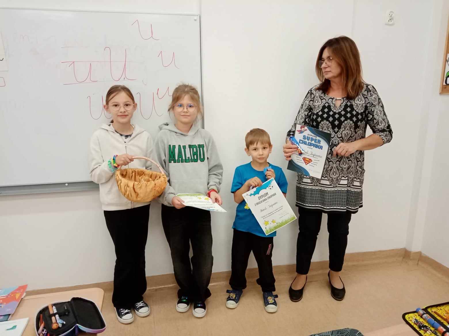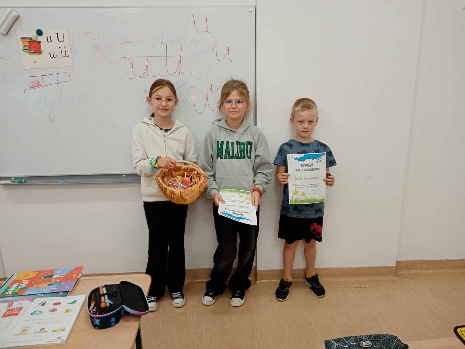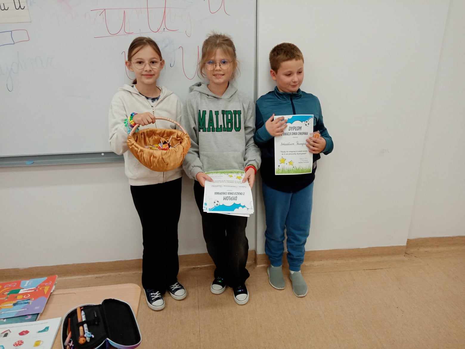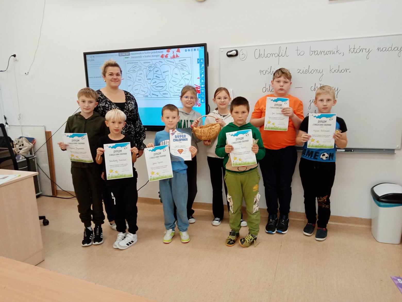 Dnia 30.09.2025 roku obchodzono w naszej szkole Dzień Chłopaka. To wyjątkowa okazja, by docenić wszystkich chłopców – tych małych i dużych, tych spokojnych i tych pełnych energii! Z tej okazji przygotowano wiele miłych niespodzianek i atrakcji, które wywołały uśmiech na niejednej twarzy! Każdy chłopiec otrzymał specjalny dyplom uznania – jako symbol sympatii, szacunku i wdzięczności za to, że po prostu są – wyjątkowi, zabawni i niepowtarzalni! W każdej klasie dziewczęta oddały głosy, wybierając Najsympatyczniejszego Chłopaka – kolegę, który swoją postawą, życzliwością i uśmiechem zdobył ich największe uznanie. To była świetna zabawa, a także okazja, by zauważyć tych, którzy często pomagają innym, są uprzejmi i zawsze można na nich liczyć! Zwycięzcy w każdej klasie otrzymali dyplom „Super Chłopaka” oraz słodki upominek, który był miłym podziękowaniem za ich serdeczność i pozytywną energię. Na korytarzu pojawiła się kolorowa gazetka poświęcona Dniu Chłopaka – z życzeniami i rysunkami. Dzięki zaangażowaniu rodziców, w klasach pojawiły się także upominki, które umiliły świętowanie. Wszystkim Chłopcom – dużym i małym – życzymy dużo radości, spełnienia marzeń, wspaniałych przygód i samych uśmiechniętych dni!