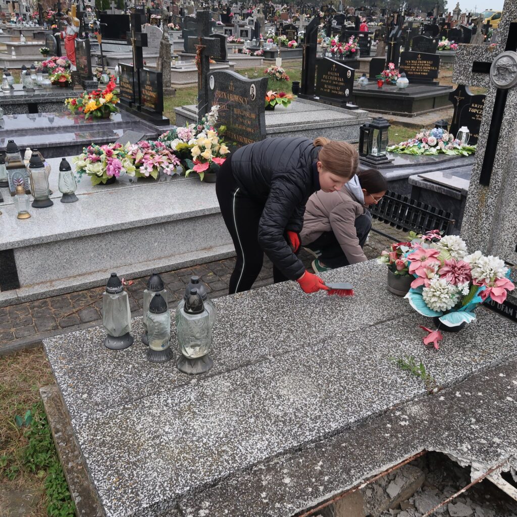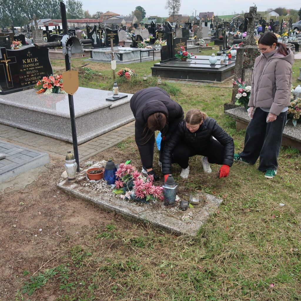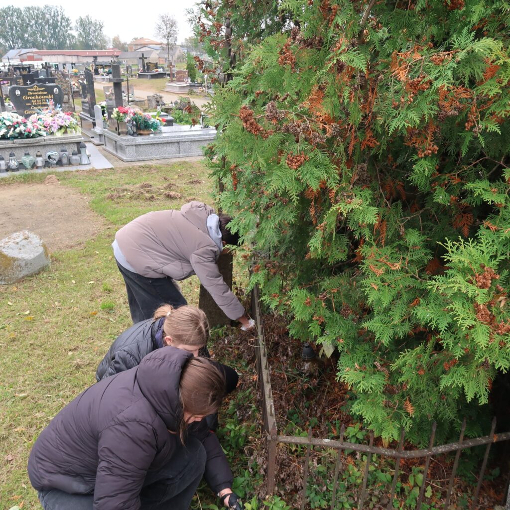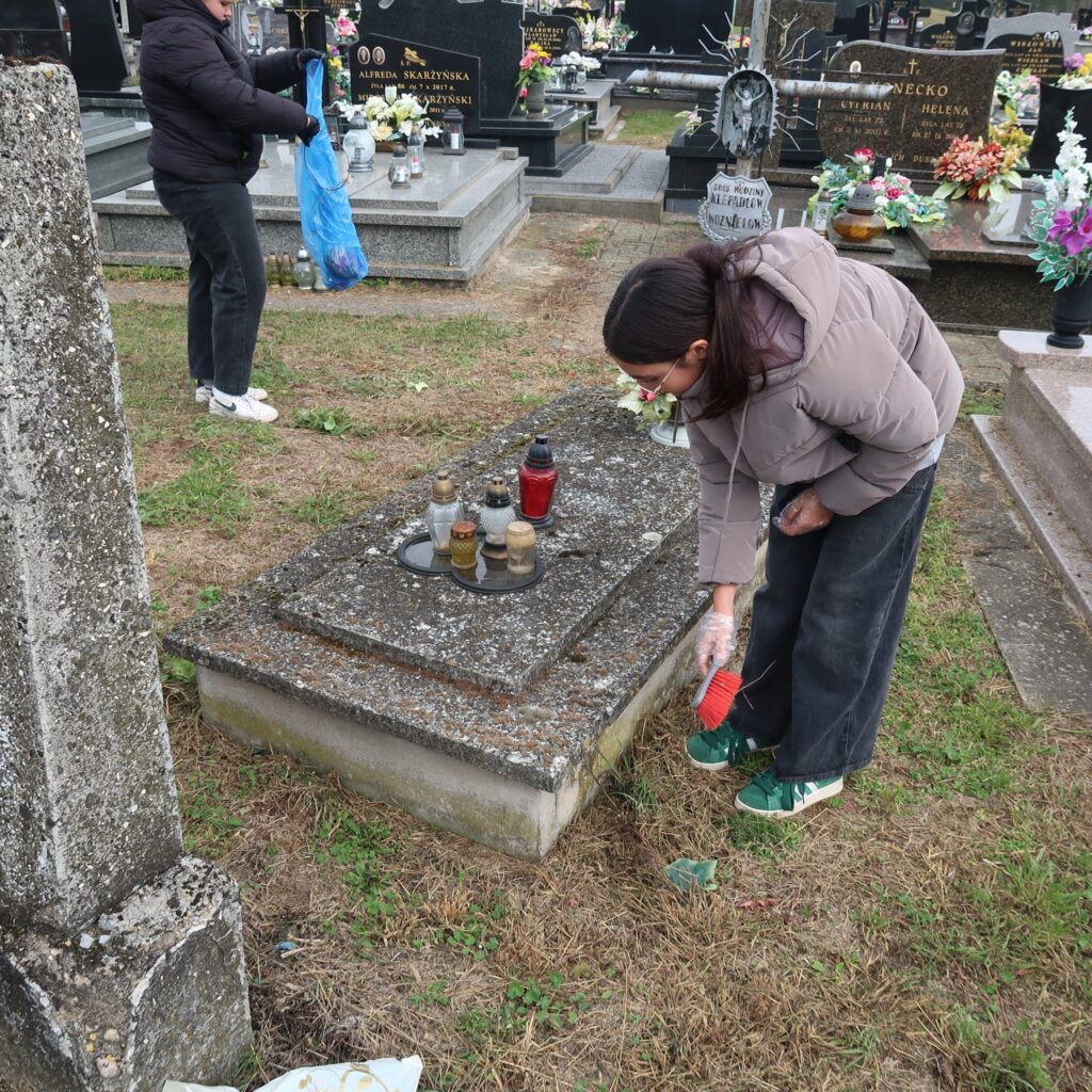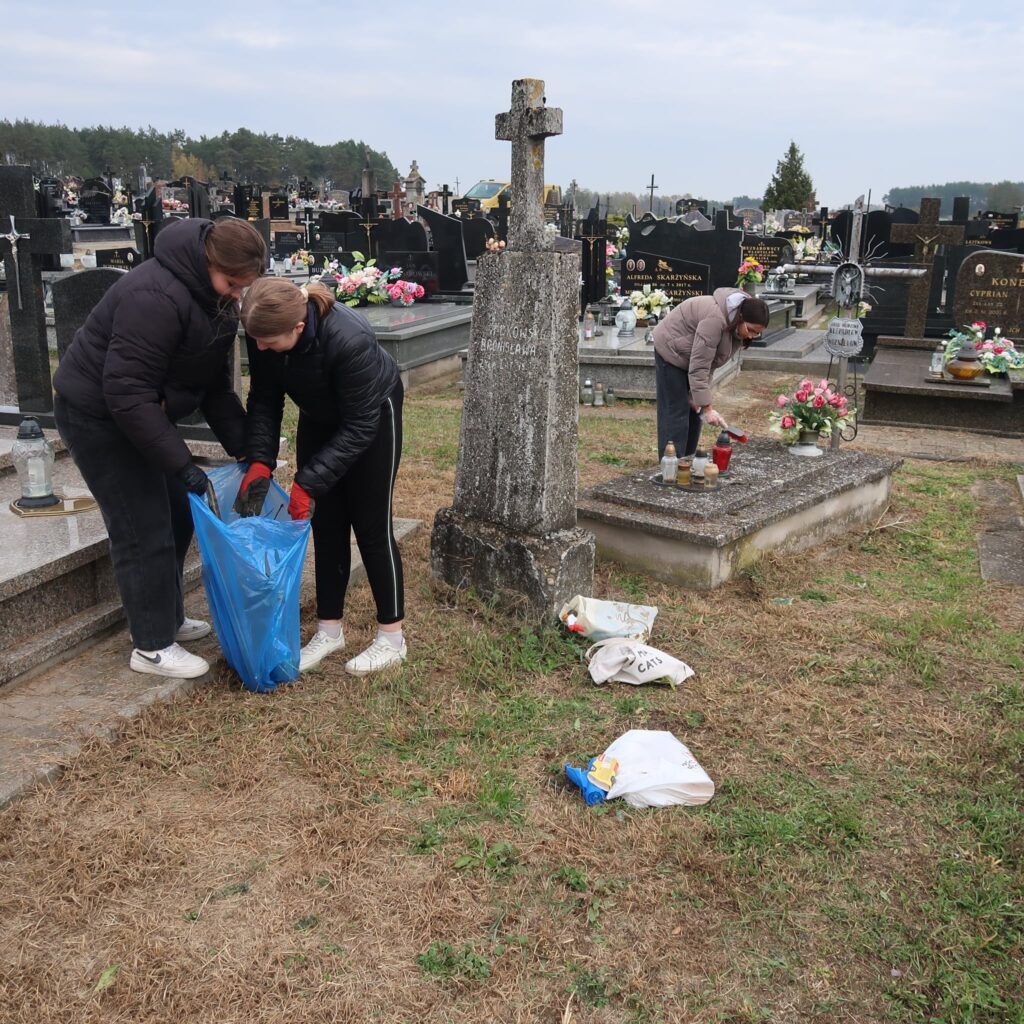 W dniu 22.10.2025r uczniowie kl. VII należący do szkolnego koła wolontariatu wzięli udział w akcji sprzątania cmentarza parafialnego w Trzciannem. Wolontariusze uprzątnęli kilkanaście grobów wyrzucając stare znicze, kwiaty itp.